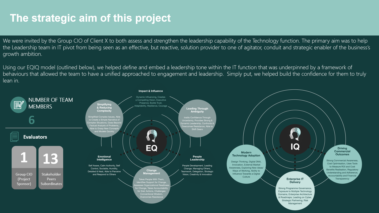 We help our clients strengthen the leadership capability within their various IT and Digital teams, increasing the value delivered from your various IT and digital investments. We take a deep dive into the culture, mission and purpose of your organisation in order to fully understand the challenges that you face in evolving towards a more digital and technology enabled business. To do this, we partner with CEOs, CHROs, Boards and Global Technology leaders in order to help identify and establish the optimal leadership culture necessary to best meet the demands placed on them.Our aim throughout this process is to help cascade these behaviours down through the lower level teams and even into their supplier/partner organisations. After all, it’s a large eco-system that needs to be well aligned for success.Our approach is to organisations with a more structured and data-driven approach to assessing Senior Technology & Digital Leaders. Using our proprietary framework (EQ/IQ) and proprietary (360 ) assessment tool, our approach help our clients make more informed decisions using data when it comes to either appointing the right people into their roles, helping teams work together and/or developing their senior leaders towards more modern/agile ways of working.